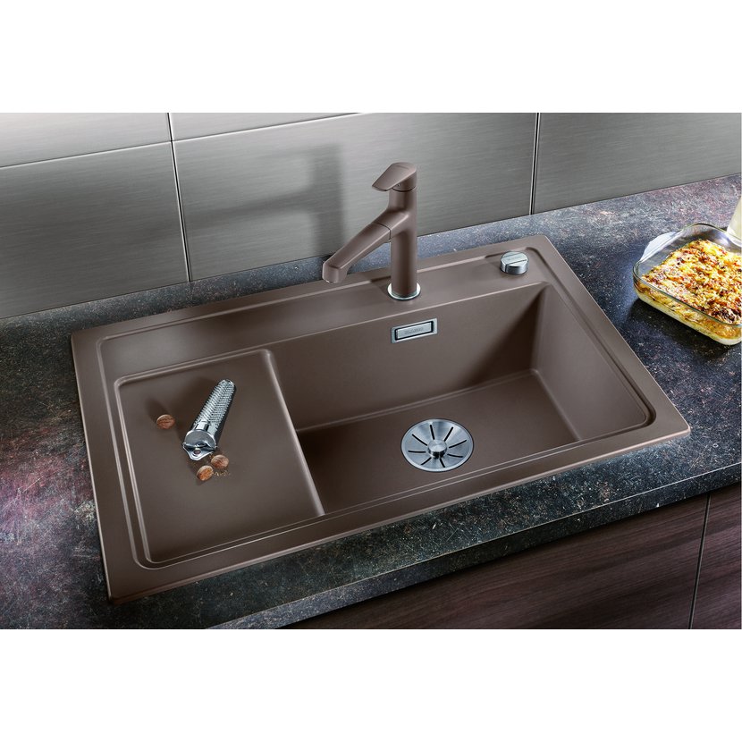 SILGRANIT® PuraDur® Nadčasová estetika s moderními funkcemi • Z vnějšku kompaktní, komfortní na omezeném prostoru • Obzvláště prostorný dřez s malou odkapovou plochou • Funkční prostor s plynulým přechodem v odkapovou plochu • Příslušenství : Lze dokoupit krájecí deska posuvná po celé délce dřezu a nerezovou misku do dřezu • Kvalitní vybavení s přepadem C-overflow® a odtokovým systémem BLANCO InFino® - elegantně integrováno, lehké na údržbu • Plochý okraj